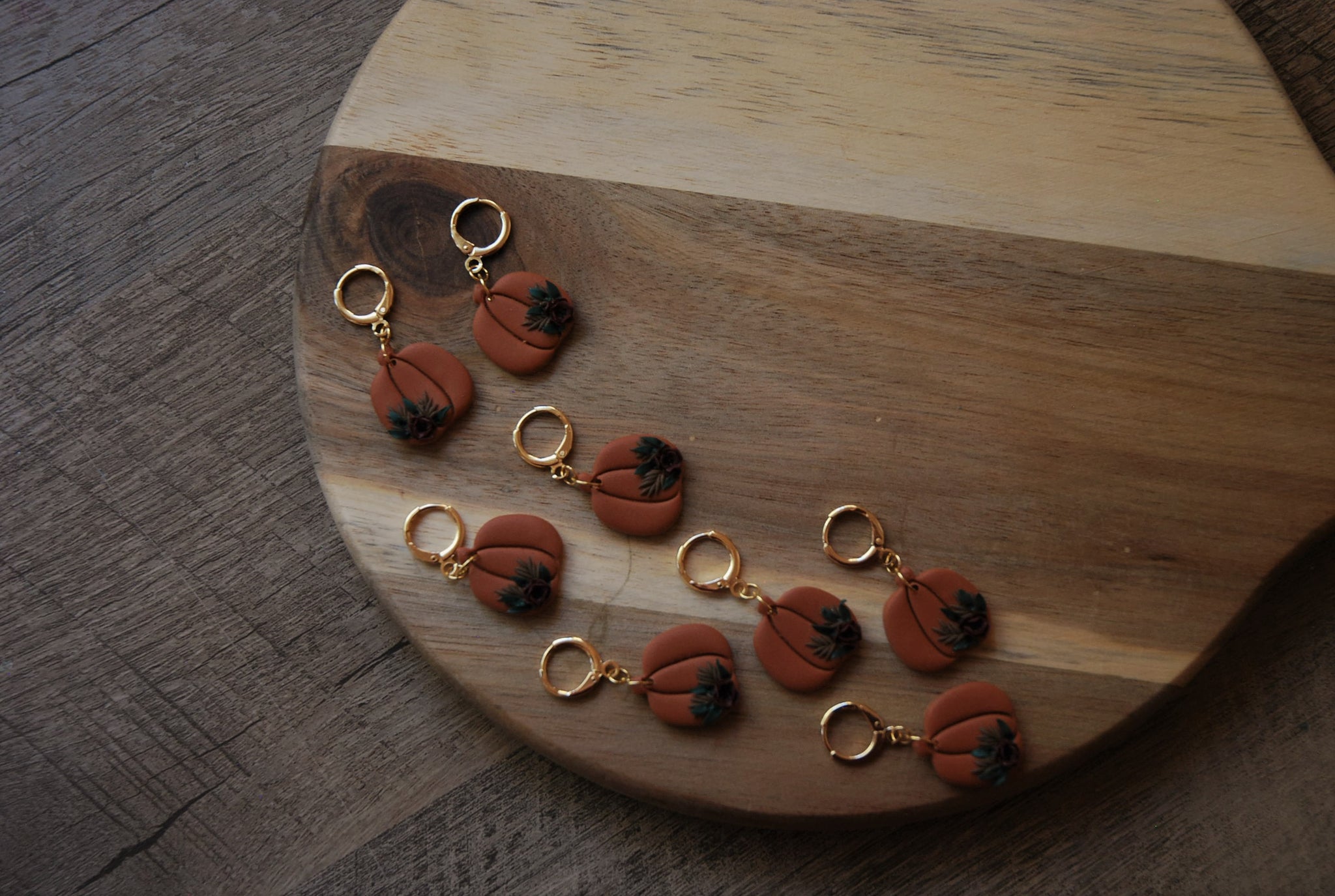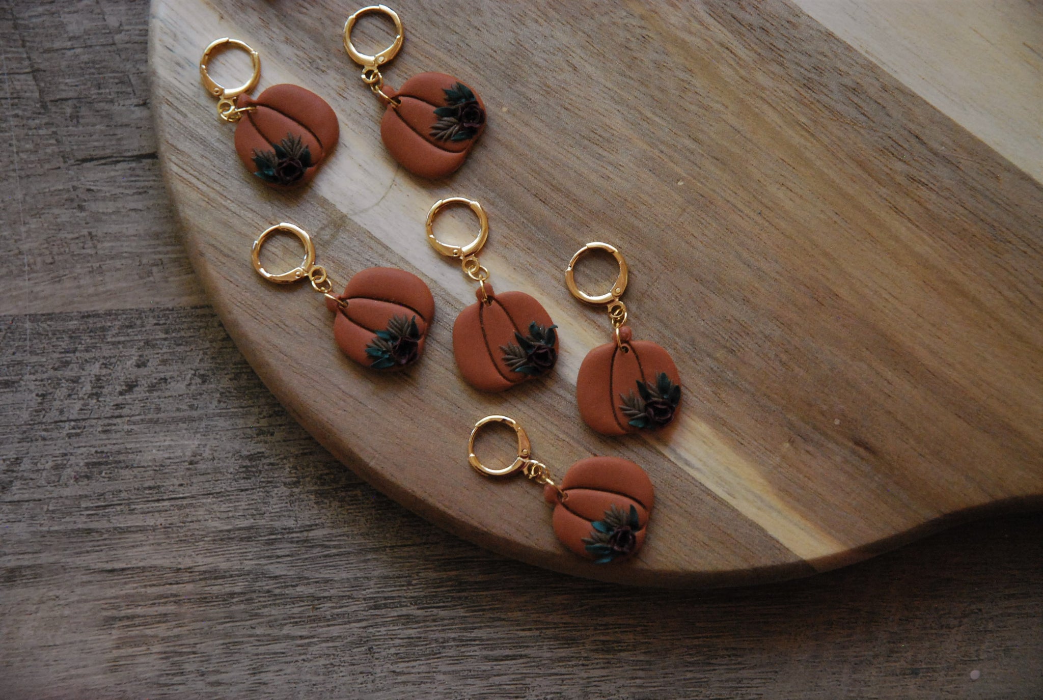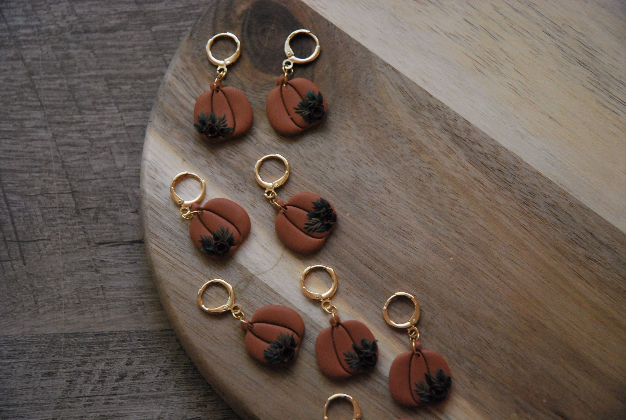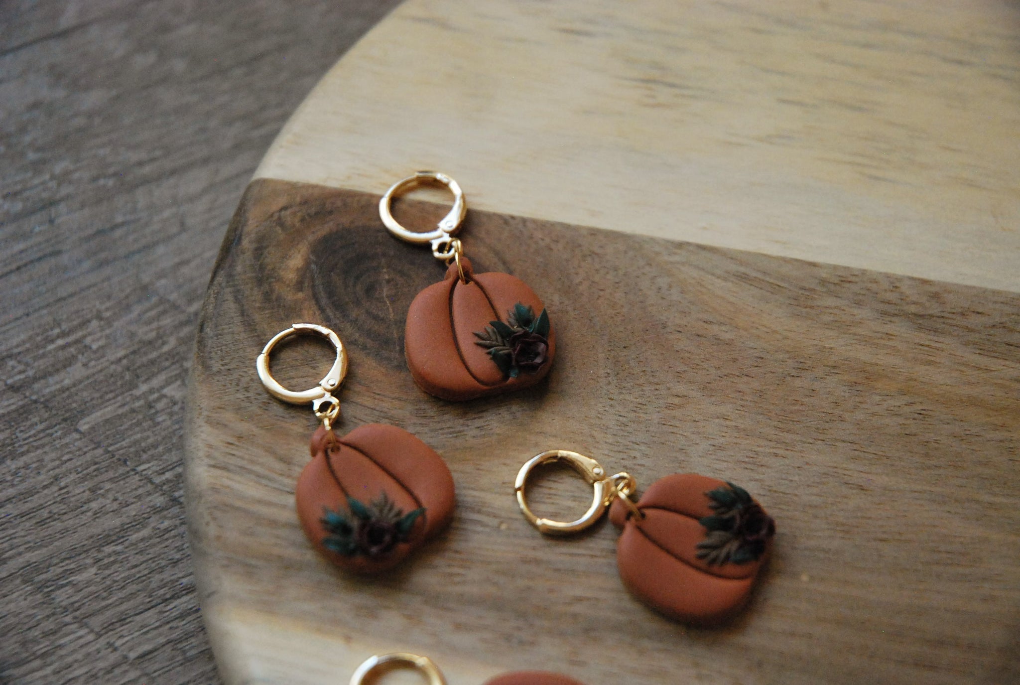 Embrace autumn elegance with these Maroon Rose Pumpkins clay earrings. Featuring a delicate rose design in rich dark orange tones, they perfectly capture the essence of fall. Lightweight and dainty, these earrings add a subtle yet stylish touch to any seasonal outfit, making them a must-have accessory for fall fashion lovers looking to stand out with unique handmade charm.