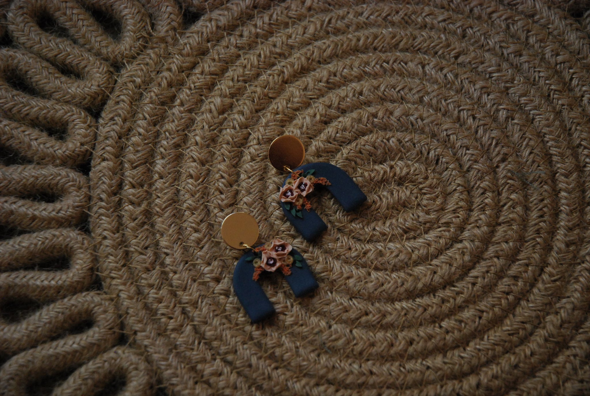Elevate your style with these handmade Navy Floral Arches earrings, featuring a unique arch shape adorned with elegant fall-colored floral designs. The rich navy blue base perfectly complements autumn hues, making these earrings an ideal accessory to enhance any outfit with seasonal charm and handcrafted artistry.